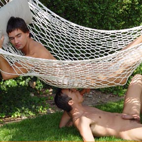 This is the scene that Jeff has been waiting to do: Bareback Fucking in the San Diego sunshine! They fuck and suck in a hammock, in a beach chair, and end up on the diving board. This is an incrediblely hot scene. Lots of hard poolside fucking and cock sucking. When these guys cum on the diving board, they swallow up every drop of each other's warm sweet jizz. Just another day in Paradise!